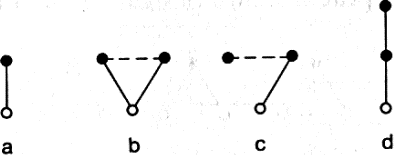 Рис. 2.8. Редупликация эффекторов На рис. 2.8 показаны схемы, которые возникают из схемы 2.7,в путем редупликации эффектора. В схеме б возбуждение одного рецептора должно по двум каналам передаваться двум эффекторам. Однако известно, что электрическое сопротивление синапсов резко падает после того, как по ним первый раз проходит ток. Поэтому если возбуждение направится по одному каналу, то этот канал связи будет закреплен, а второй окажется шунтированным и может «отсохнуть» (схема в). Затем возбуждение может продолжить дорогу через штриховую связь (схема г), что знаменует зарождение первого уровня классификаторов. На рис. 2.9 представлены возможные варианты развития трехнейронной схемы 2.8,г. Три группы схем соответствуют редупликации различных подсистем исходной системы. Редуплицируемая подсистема обведена кружком. Первая группа (a, б, в) объясняет разрастание нулевого уровня, вторая группа (г, д, е) — первого уровня иерархии классификаторов. В третьей группе (ж, з, и, к) мы видим схемы, возникающие при редупликации одного классификатора первого уровня без связанного с ним рецептора. Переход от схемы з к схеме и объясняется тем «отсыханием» шунтированного канала, которое мы описали выше. Схема к, появившаяся в конечном счете, существенно отличается от всех остальных схем, представлявших иерархии классификаторов. В этой схеме один из классификаторов «повисает в воздухе» — он не получает информации из внешнего мира. Может ли такая схема быть полезной животному? Да: ведь это и есть схема регулирования!