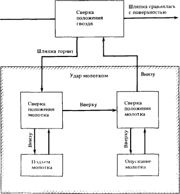 Рис. 2.14. Иерархический план забивания гвоздя Так как операционный компонент единицы T-O-T-E может быть составным и требовать выполнения нескольких подчиненных планов, единицы T-O-T-E могут иметь иерархическую структуру. Миллер, Галантер и Прибрам приводят следующий пример. Если удар молотком по гвоздю представить как двухфазное действие, слагающееся из подъема и опускания молотка, то функциональная схема на рис. 2.11, изображающая план забивания гвоздя, перейдет в схему на рис. 2.14. Эта схема в свою очередь может входить в качестве элемента в операционный компонент схемы T-O-T-E более высокого уровня. Мы видели, что элементарной функциональной схеме на рис. 2.10 соответствует элементарная структурная схема на рис. 2.6. Что происходит со структурной схемой, когда планы образуют иерархию? Точнее, наоборот: какие структурные схемы могут обеспечить выполнение иерархически построенного плана? Можно предположить различные варианты таких схем. Например, можно представить, что блок сравнения всегда один и всегда пользуется одной и той же подсистемой, хранящей цель, но состояние этой последней (т. е. цели) меняется под действием других частей системы, обеспечивая вытекающую из плана смену целей. Напротив, можно представить, что пара — блок сравнения и цель — размножается многократно, и при выполнении иерархического плана управление переходит от одной пары к другой. Можно предположить комбинацию этих двух способов. И вообще можно придумать множество различно устроенных кибернетических устройств, осуществляющих одну и ту же иерархическую функциональную схему. Ясно только, что они будут иметь иерархическую структуру и что устройства такого типа могли возникнуть эволюционно путем редупликации подсистем и отбора полезных вариантов. Каковы же структурные схемы, реально возникшие в процессе эволюции? Увы, пока мы этого достоверно не знаем. Поэтому-то нам и пришлось перейти к функциональным схемам. И это только первое из ограничений, которые мы будем вынуждены накладывать на стремление к точному кибернетическому описанию высшей нервной деятельности. Мы очень мало знаем сейчас о кибернетической структуре и работе мозга высших животных и, тем более, человека. Собственно говоря, мы почти ничего не знаем. Есть только отдельные факты и предположения. Поэтому в дальнейшем анализе нам придется опираться главным образом на феноменологию — данные бихевиористики и психологии, где дело обстоит несколько лучше. Что касается кибернетического аспекта, то мы перейдем на уровень чрезвычайно общих понятий. На этом уровне мы обнаружим определенные закономерности, столь общие, что они объясняют этапы развития как нервной системы, так и человеческой культуры и, в частности, науки. Тот относительно конкретный анализ первых этапов эволюции нервной системы, который позволило нам сделать нынешнее состояние знаний, послужит нам разбегом для последующего более абстрактного анализа. Конечно, нашей истинной целью является именно этот абстрактный анализ, но было бы приятнее, если бы, зная кибернетику мозга, мы могли совершить переход от конкретного к абстрактному более плавно и обоснованно. 2.15. Определение сложного рефлексаПодводя итог описанию четвертого этапа развития, мы можем определить сложный рефлекс как такой процесс, когда возбуждение рецепторов, вызван